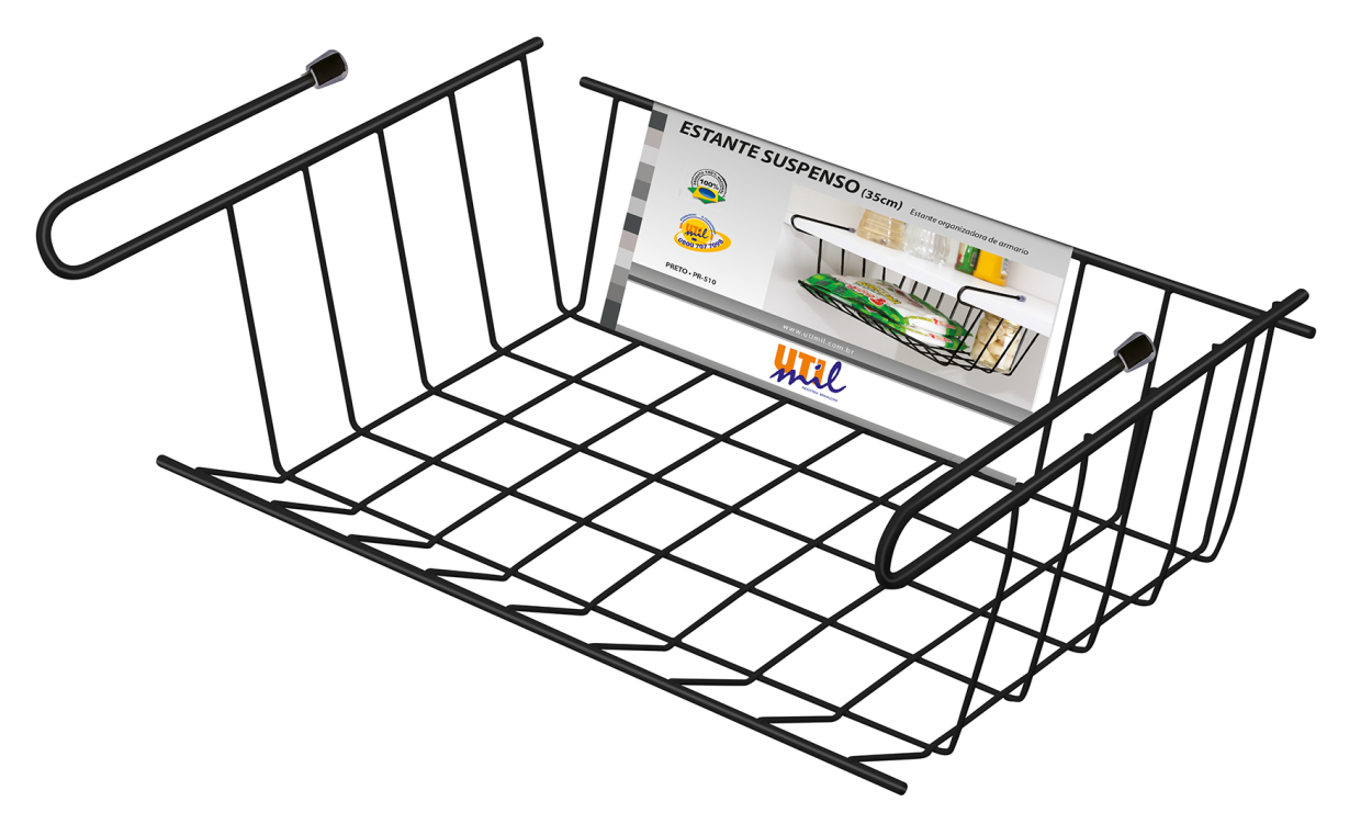 A estante suspenso Utimil é excelente para organizar armários e prateleiras na cozinha, lavanderia, closet e armários em geral. A estante é produzida em arame cromado. Ela é fácil de instalar. Basta encaixar as duas hastes.