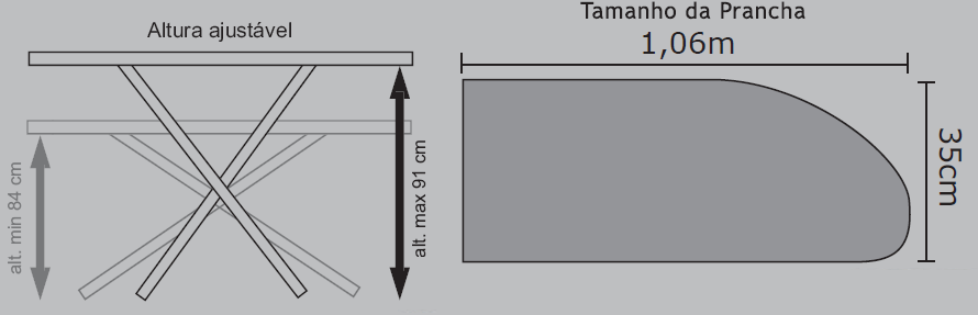 A estrutura em tubo com pernas bem abertas e ponteiras antiderrapantes deixam a mesa muito firme. A prancha da mesa possui uma forração em tecido metalizado a base de pasta de pó de alumínio onde o tecido é mais impermeável, absorve menos sujeira e o ferro de passar desliza melhor. A regulagem de altura em 4 posições permite ajustar a mesa na altura desejada. O porta ferro é em tubo com encaixe para evitar do ferro cair.