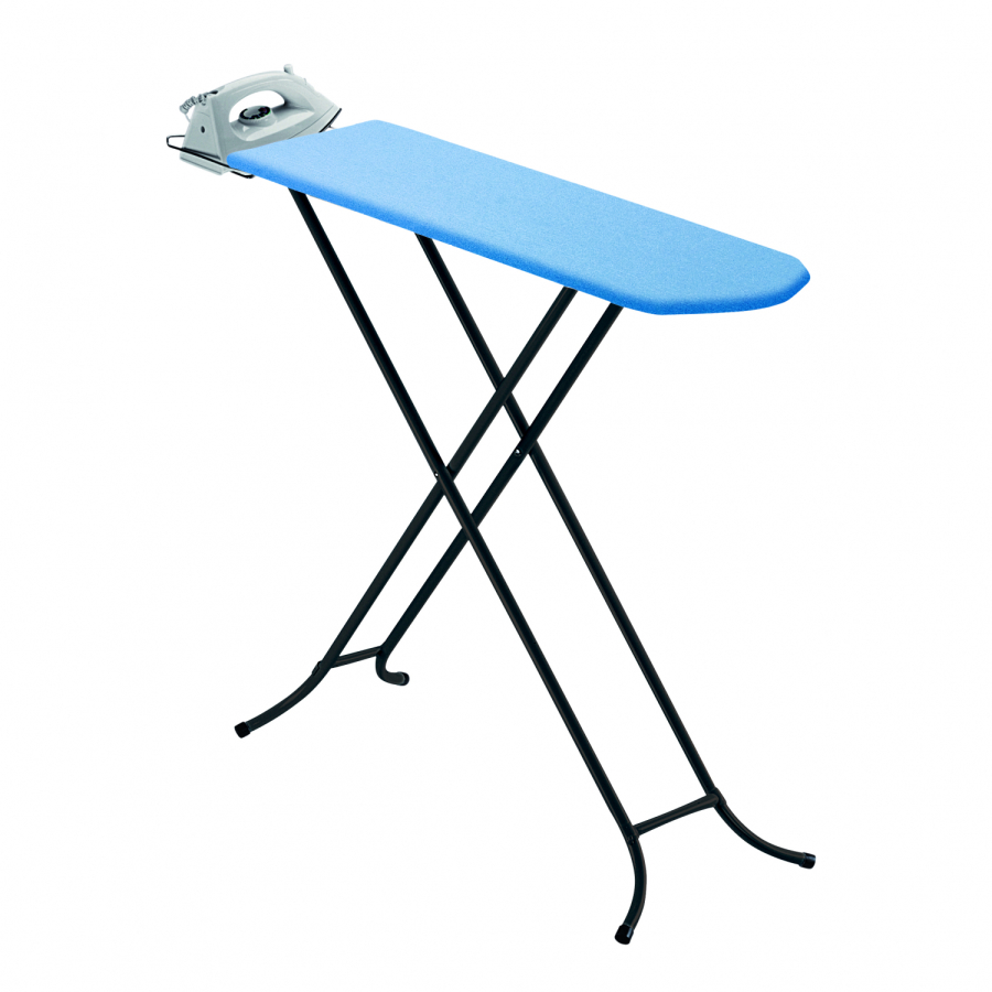 É uma mesa de passar de tamanho menor, todavia muito firme, possui pernas bem abertas, prancha em madeira grossa, espessura 12 mm e porta ferro retrátil.